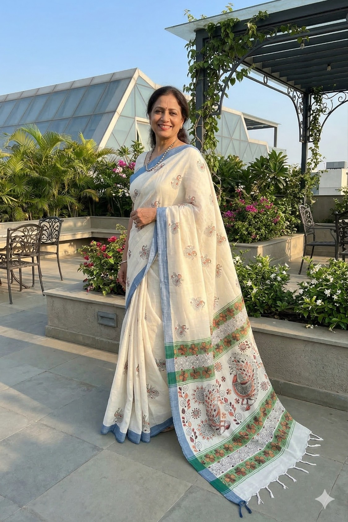 Experience the airy luxury of authentic Handloom Cotton. The White base offers a fresh, serene canvas that radiates a calm and poised energy. This saree is designed for the woman who loves storytelling in her attire, combining the royal symbolism of the peacock with a relaxed, breathable drape.