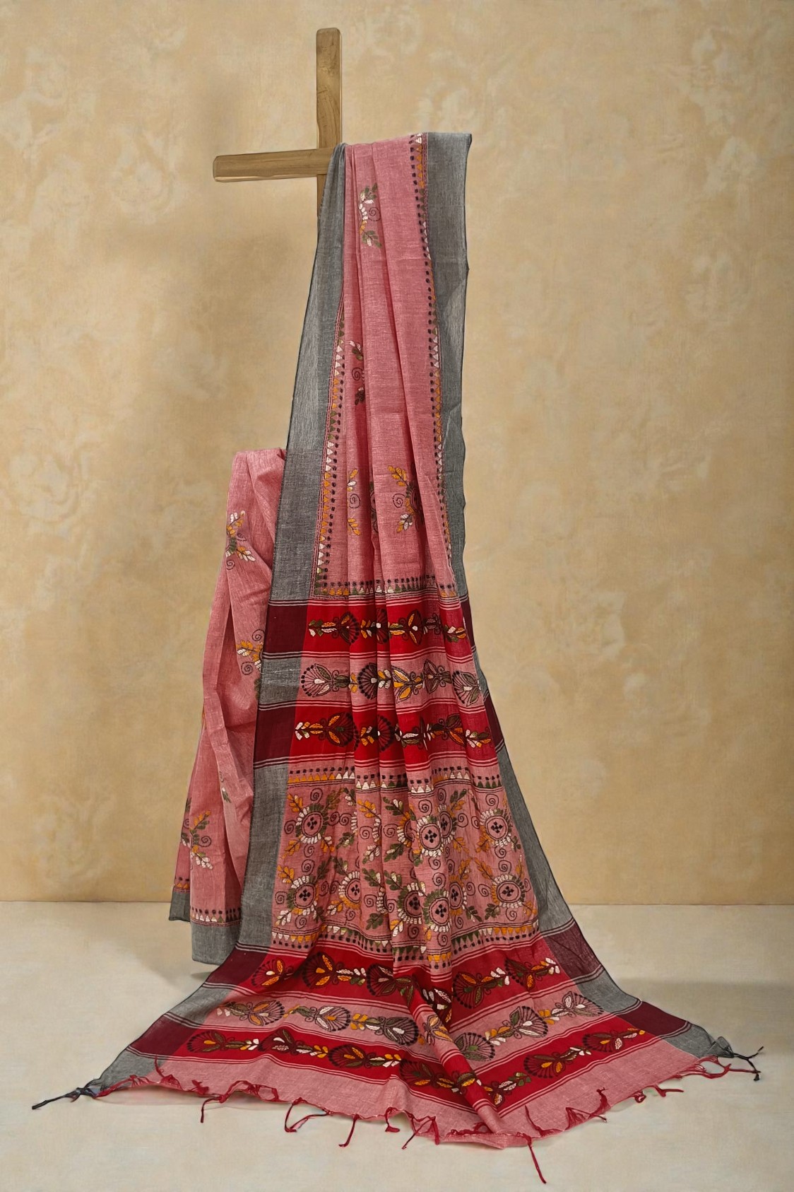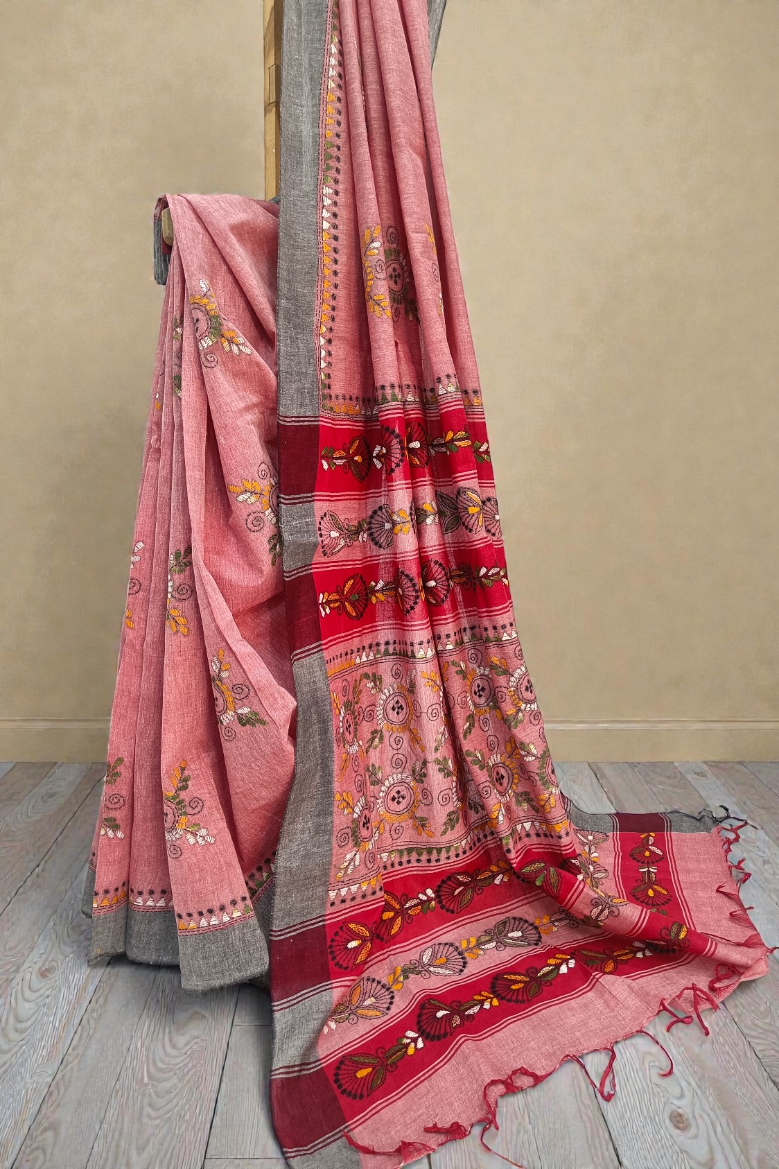 Home Sarees The Radiant Pastel: Onion Pink Khadi Cotton Kantha Saree