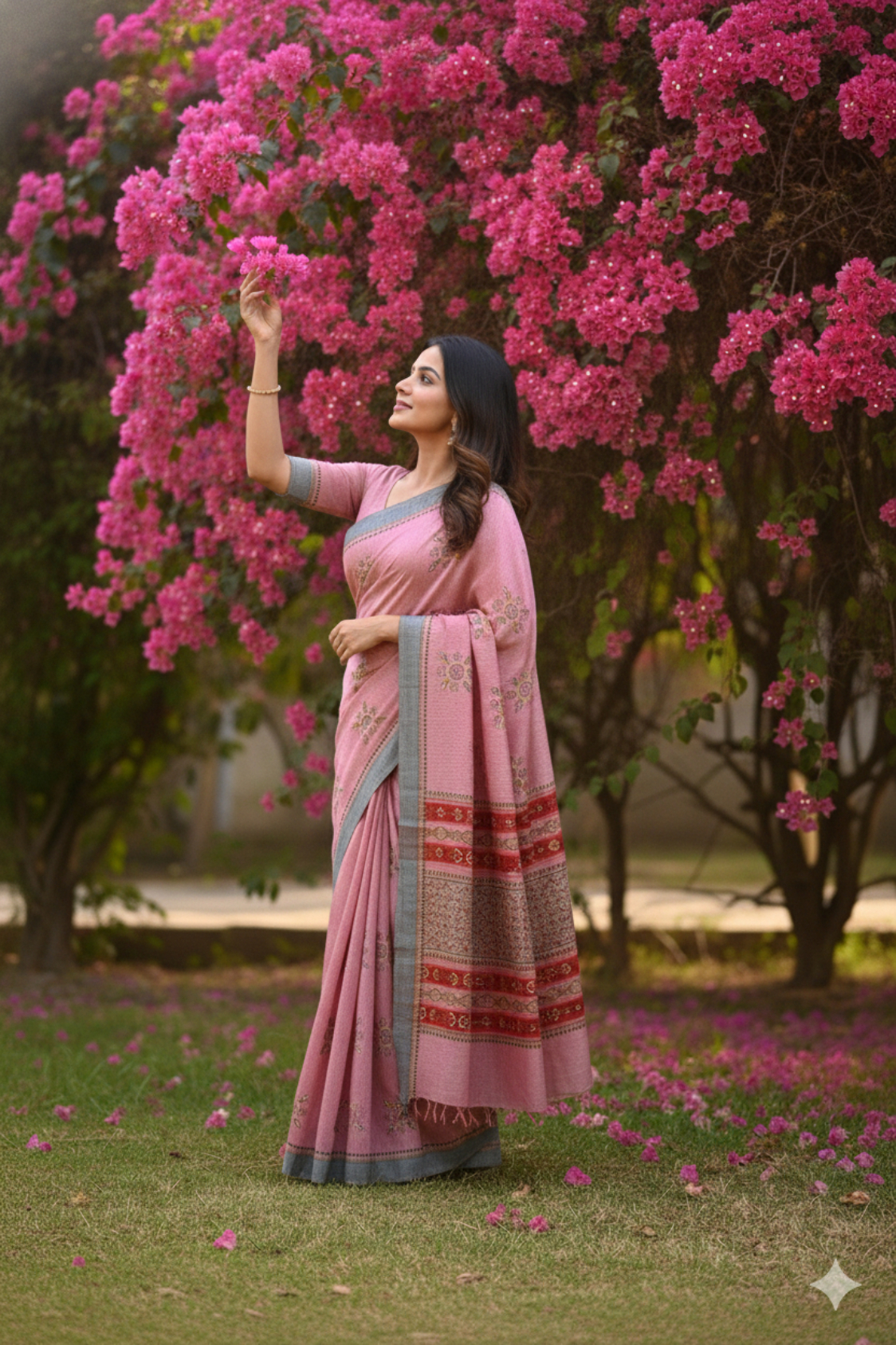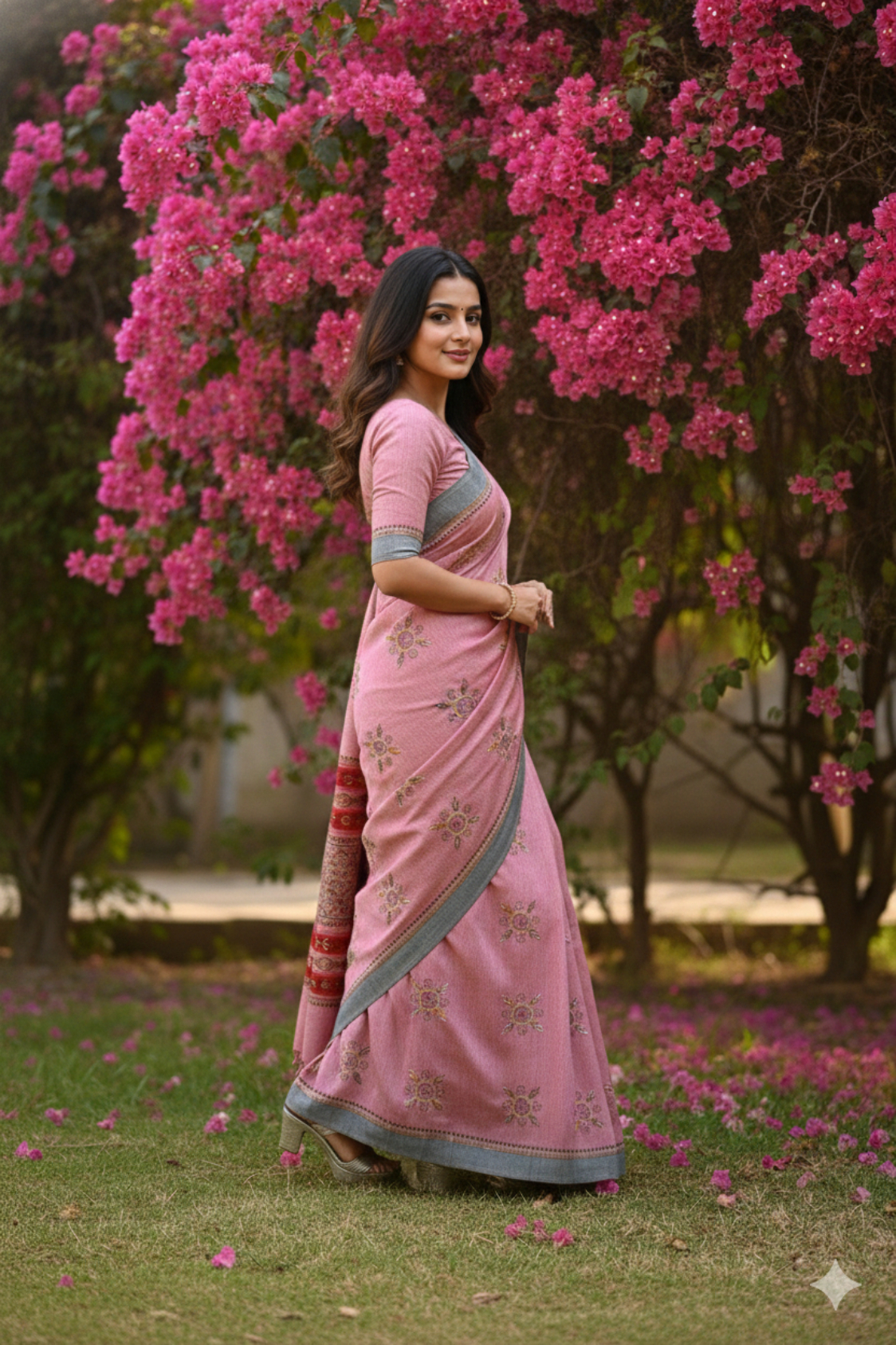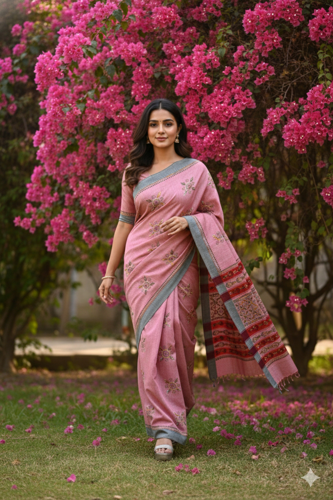 • Modern Grey Frame: A continuous Grey border runs along the edges of the saree, providing a sophisticated, neutral frame that grounds the warm pink tones.