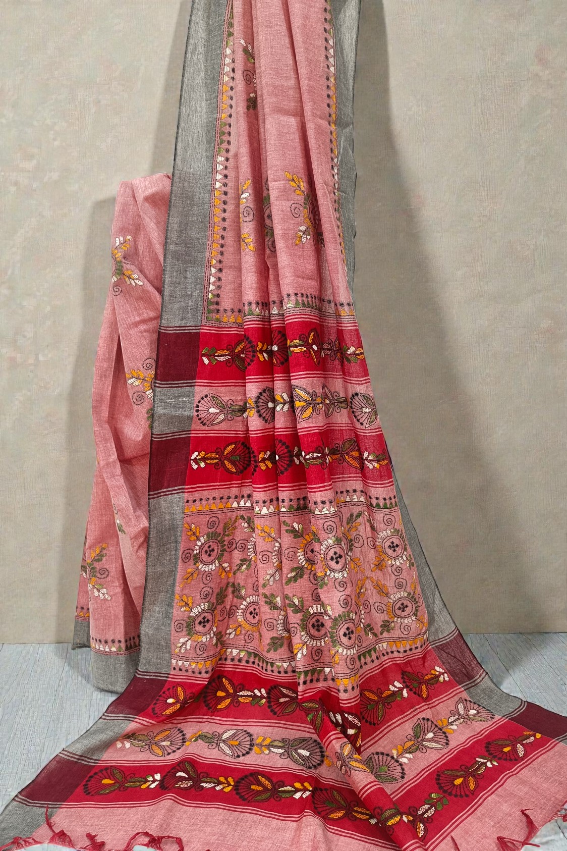 Light Grey Handloom Cotton Kantha Embroidery Saree