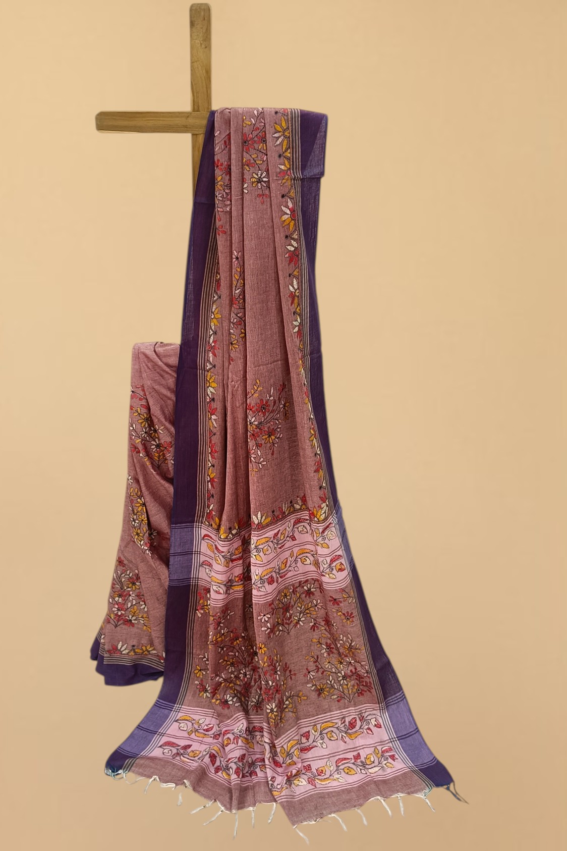 Experience the weightless luxury of authentic Handloom Cotton. The Onion Pink base offers a muted, elegant glow that radiates a calm and poised energy, while the bold Purple border provides a regal, structural frame. This saree is designed for the woman who appreciates the “slow fashion” beauty of meticulous hand-stitched art.
