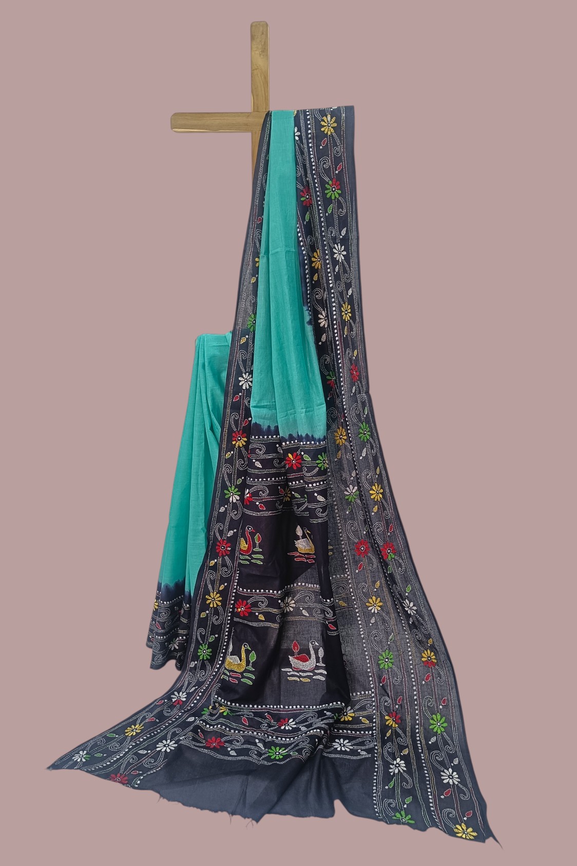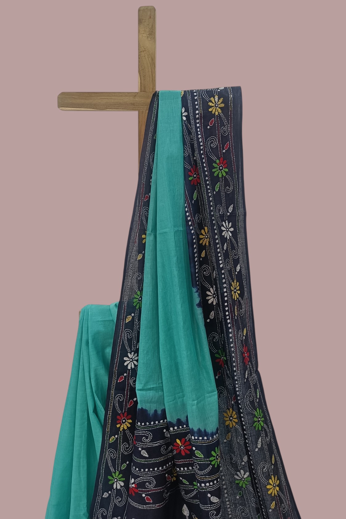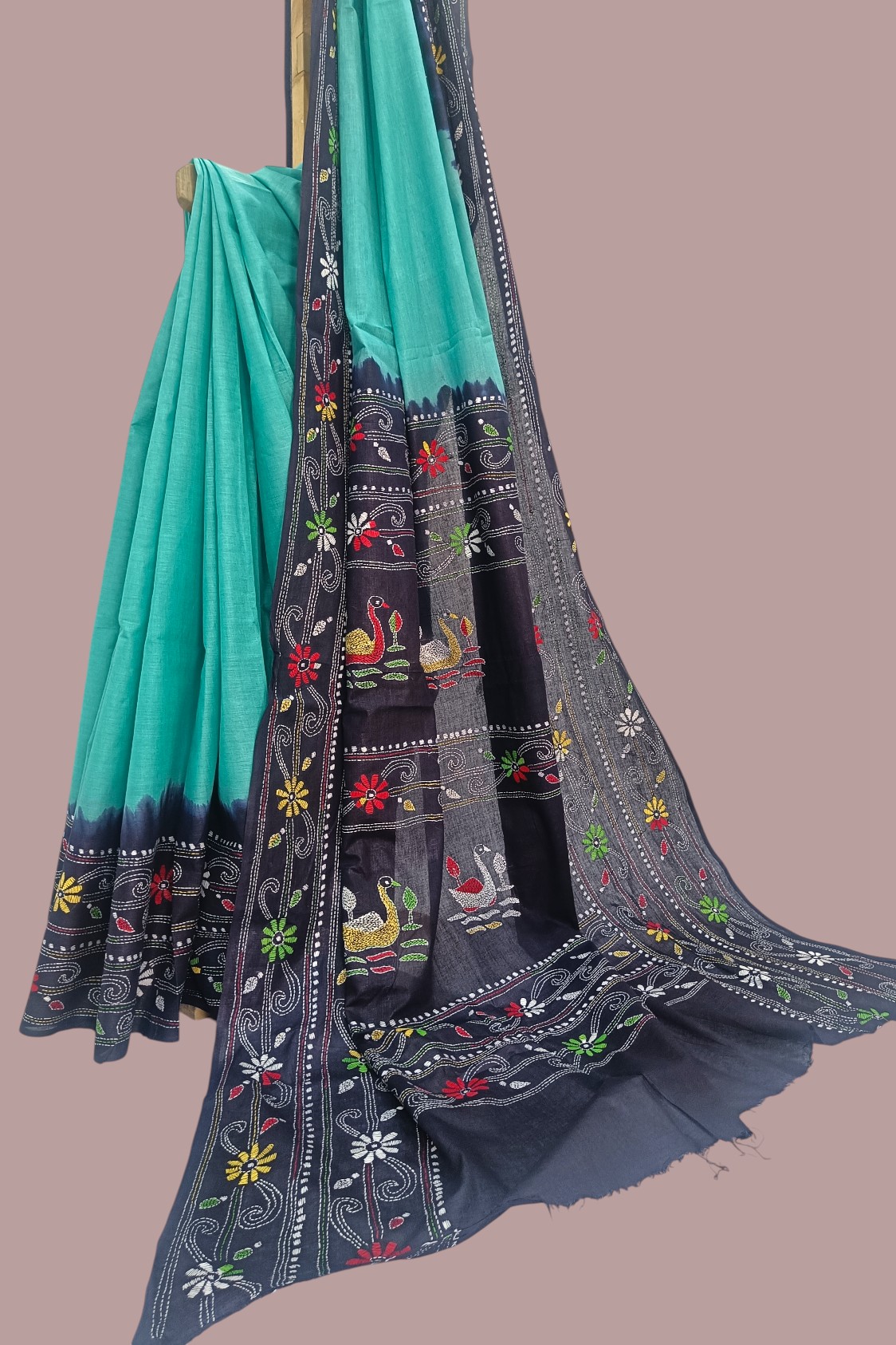- Minimalist Body with Nautical Borders: The main body remains plain Sea Green, highlighting the soft texture of the handloom weave. This is framed by broad Dark Blue dyed borders on both edges, which are further detailed with a continuous Kantha embroidery border.
