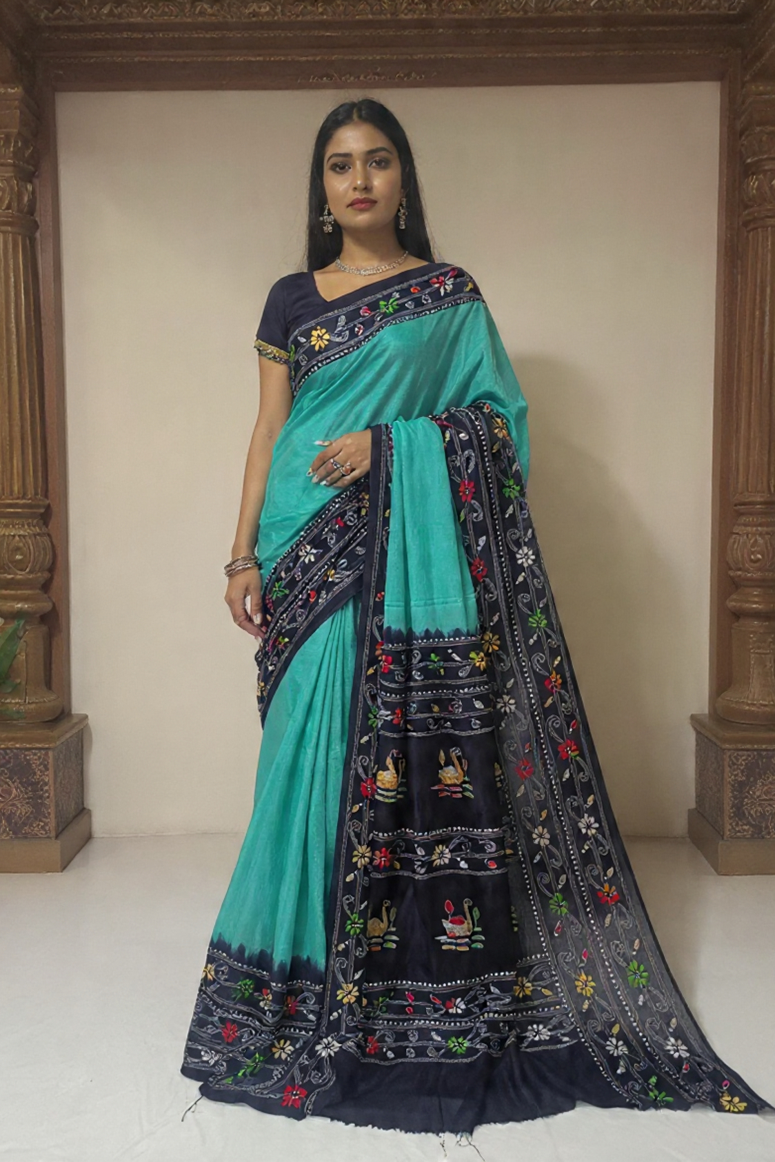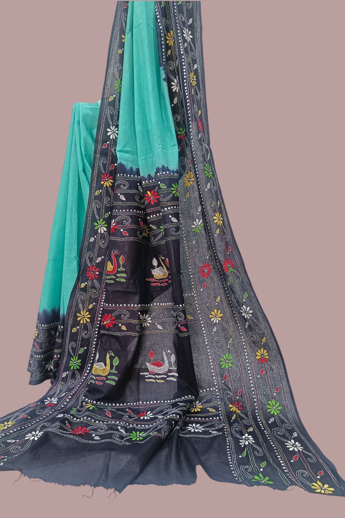 The Serene Swan: Sea Green & Dark Blue Handloom Kantha Saree