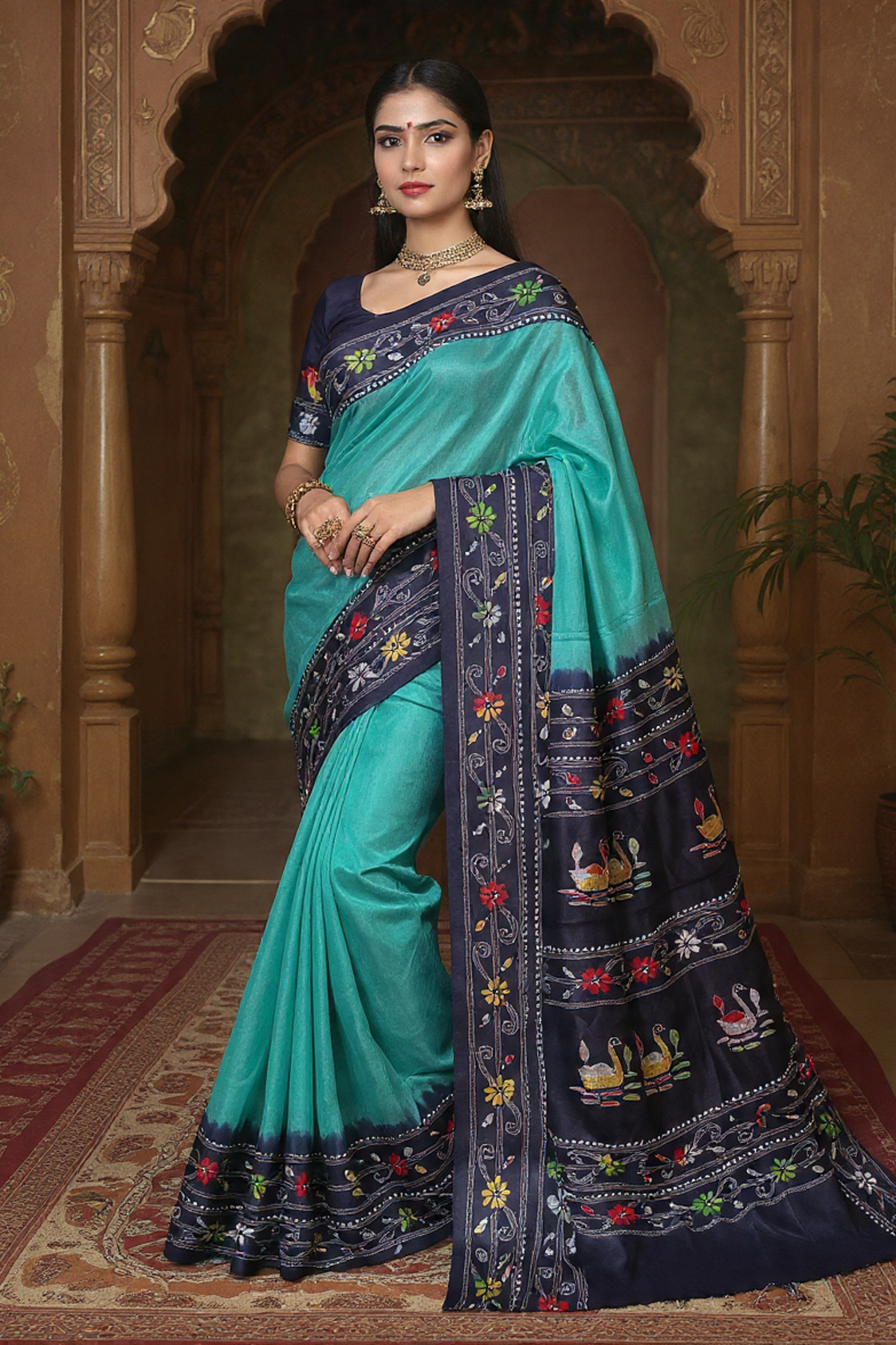The unique combination of the swan motifs and the sea-inspired palette makes this saree a versatile favorite: