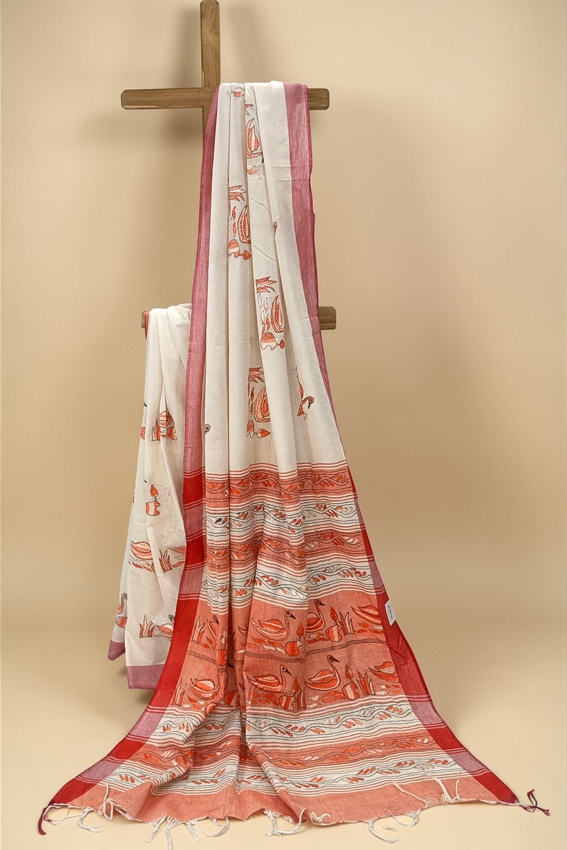 - Brick Red Frame: A continuous Brick Red border runs throughout the length of the saree. This earthy, grounding frame provides a sharp silhouette and adds a touch of rustic elegance to the pristine white base.
