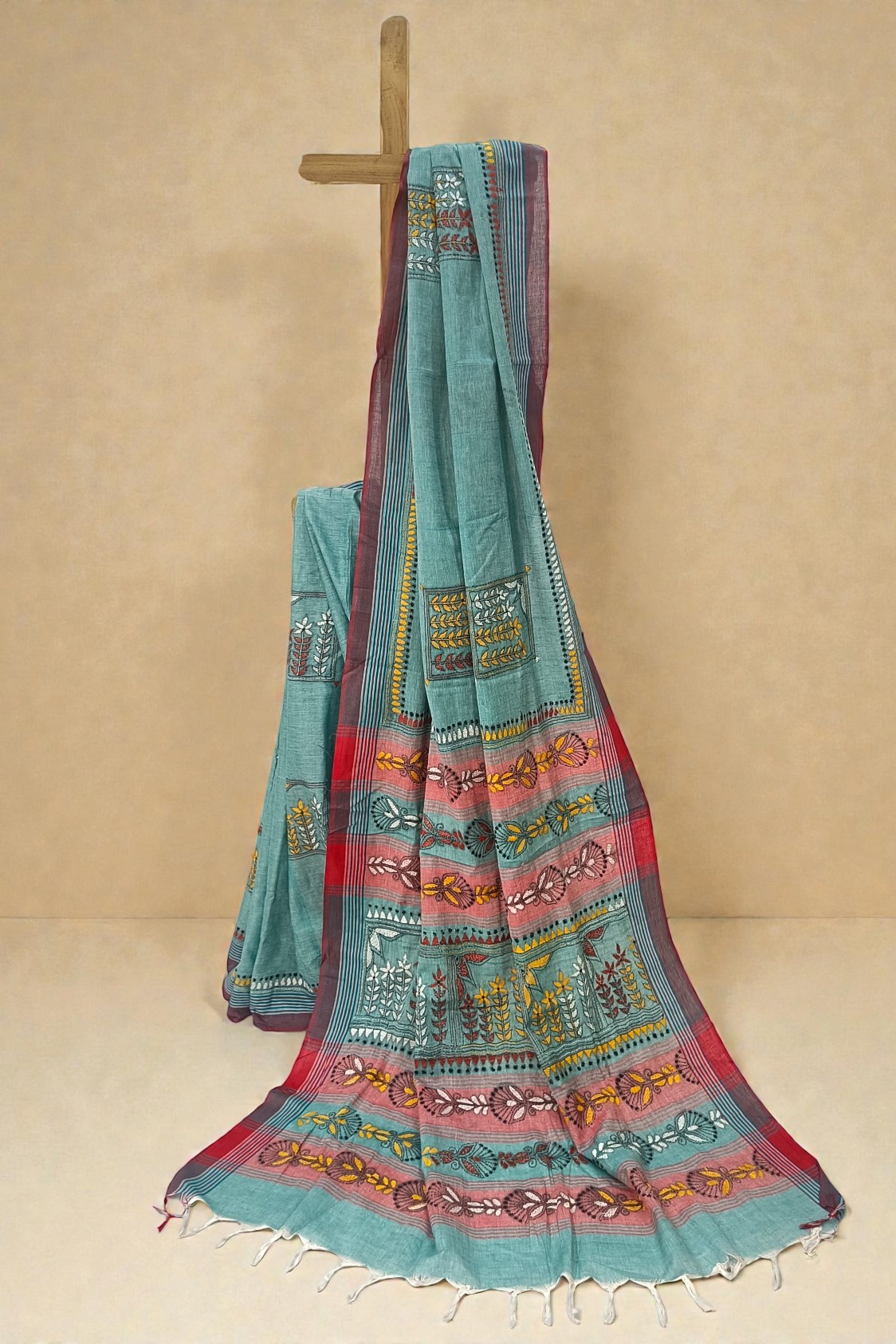 Home Sarees The Tropical Forest: Teal Khadi Cotton Kantha Saree