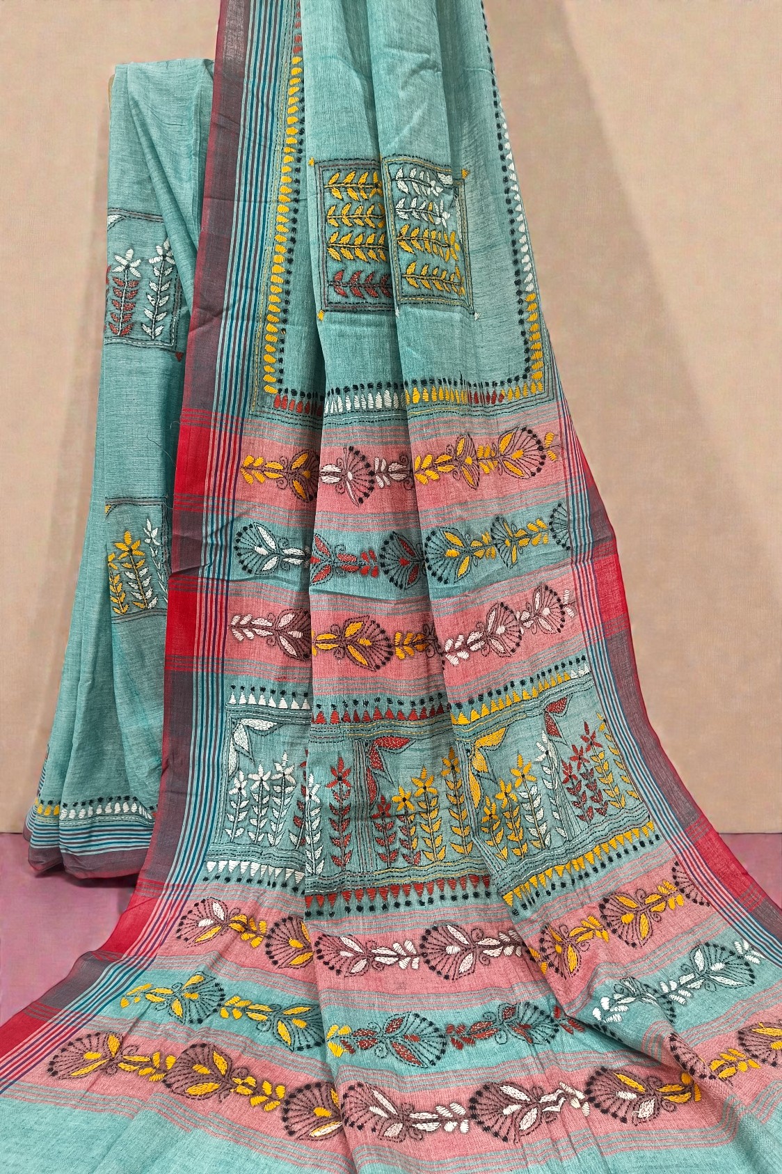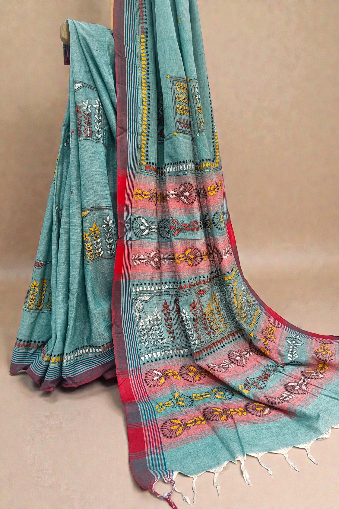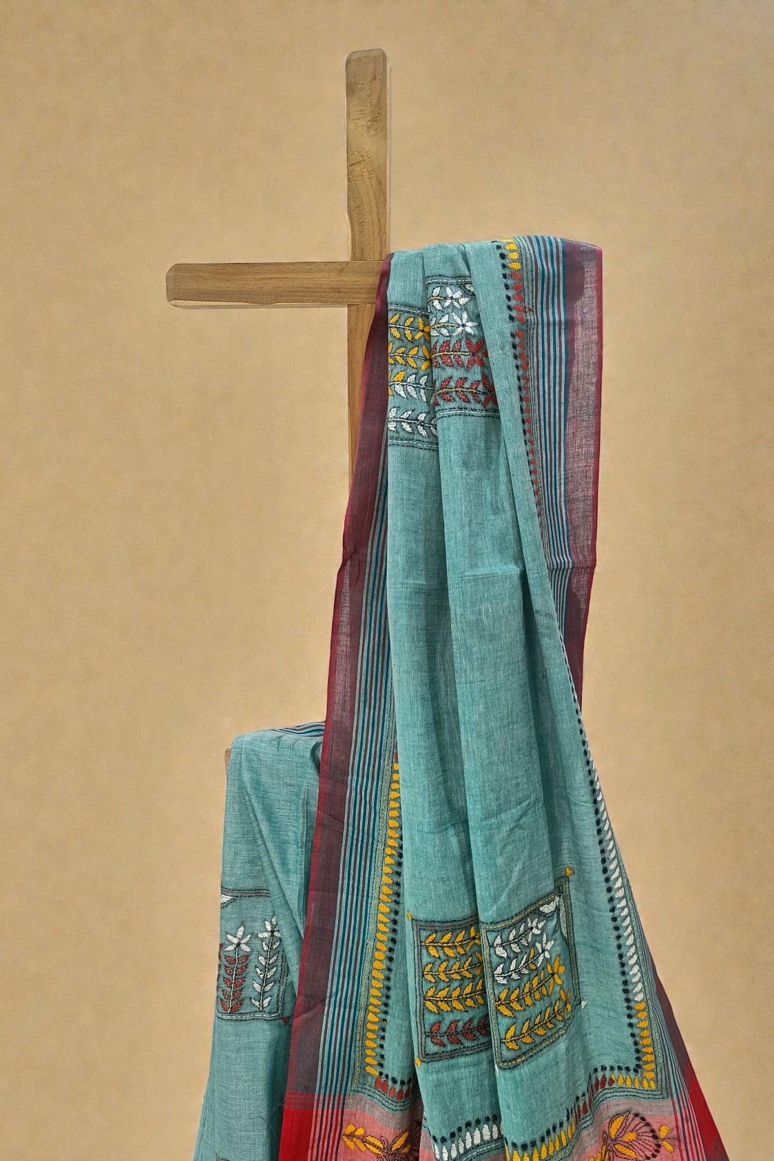 The Tropical Forest: Teal Khadi Cotton Kantha Saree
