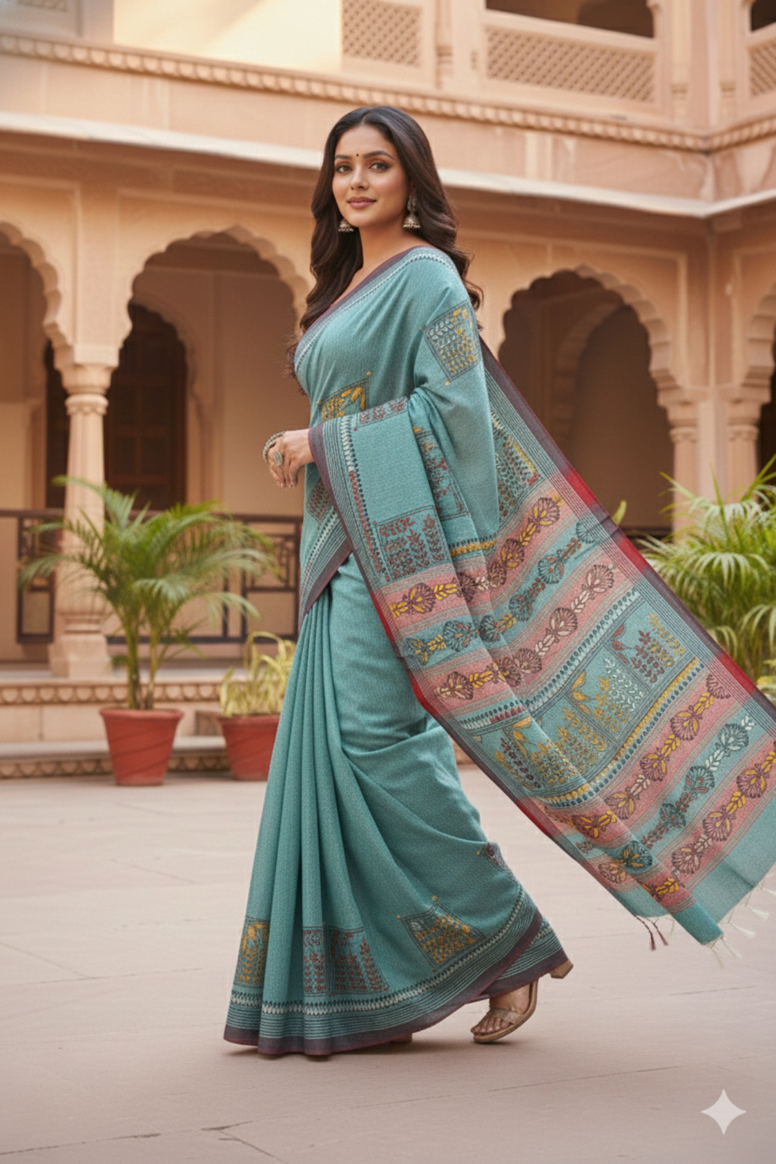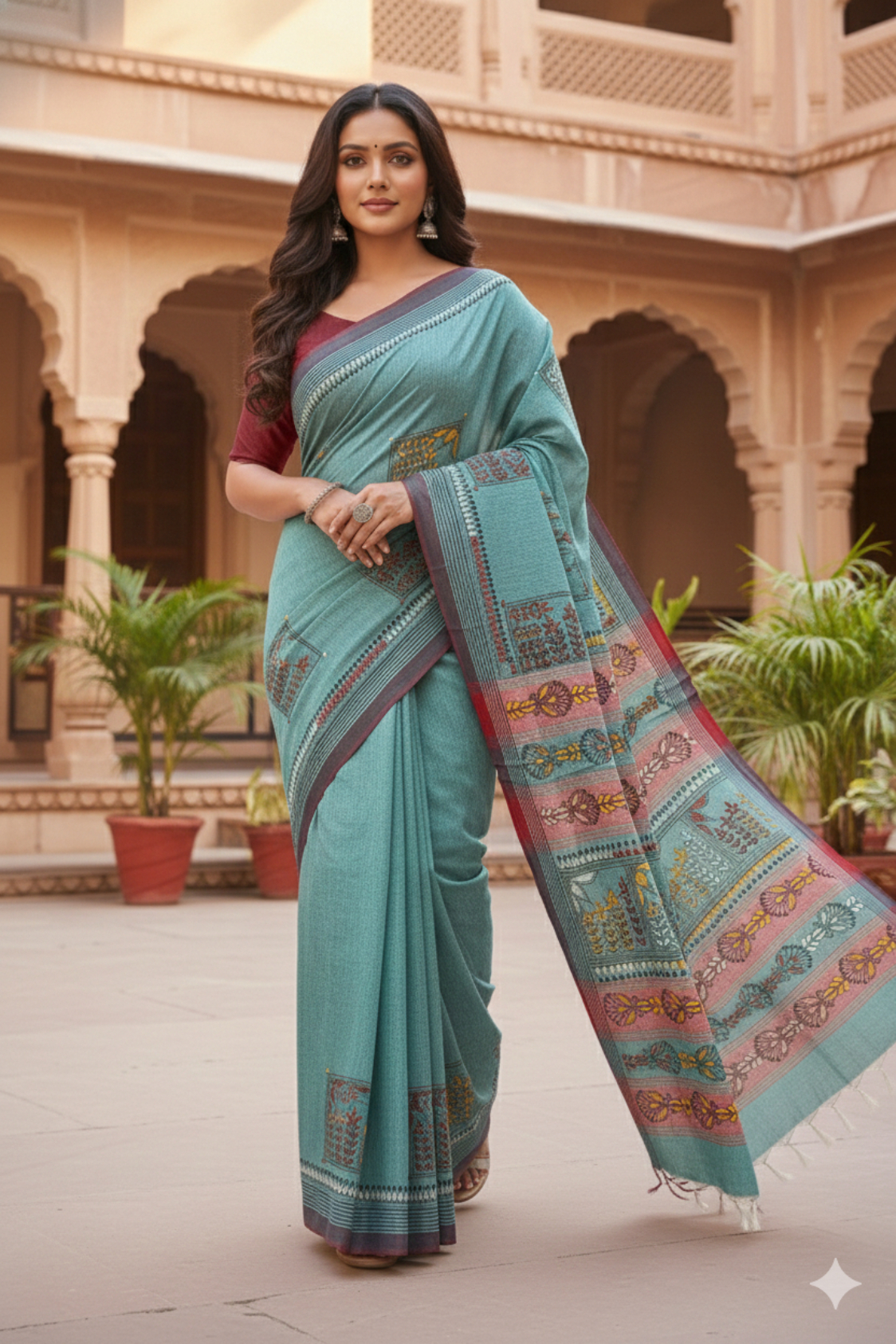 Embrace the rustic charm of authentic Khadi Cotton. This saree features a rich Tropical Teal base—a color that balances the energy of green with the calm of blue. The fabric is soft, highly breathable, and possesses that unique hand-loomed texture that only improves with every wear.