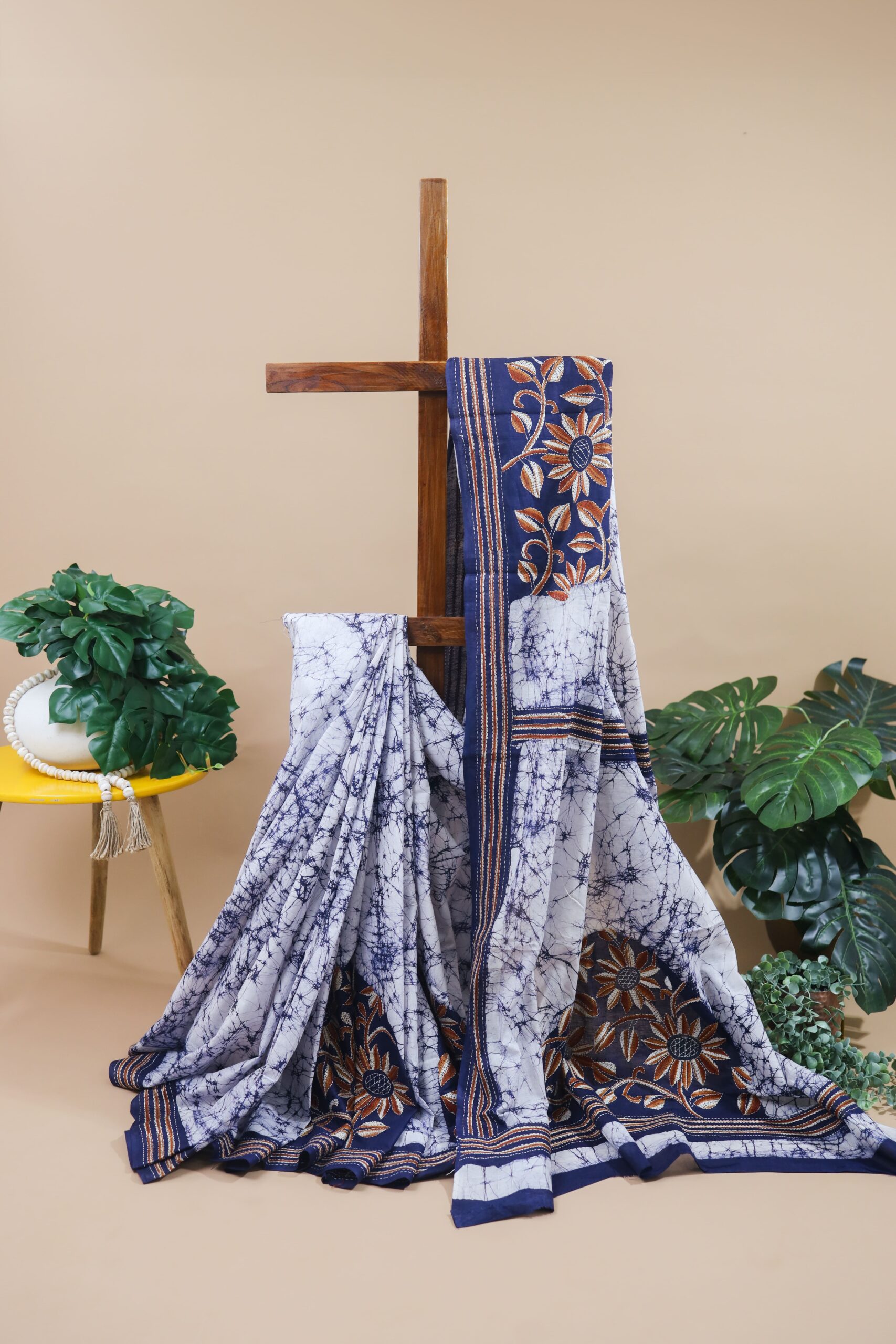 A beautiful white and ink blue cotton batik sari with intricate kantha embroidery floral