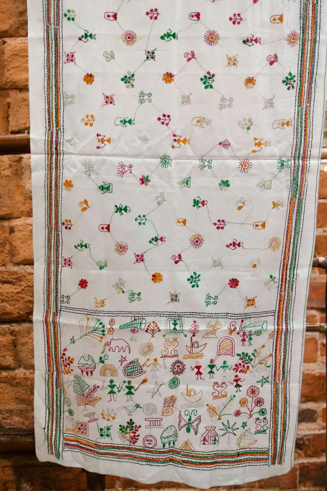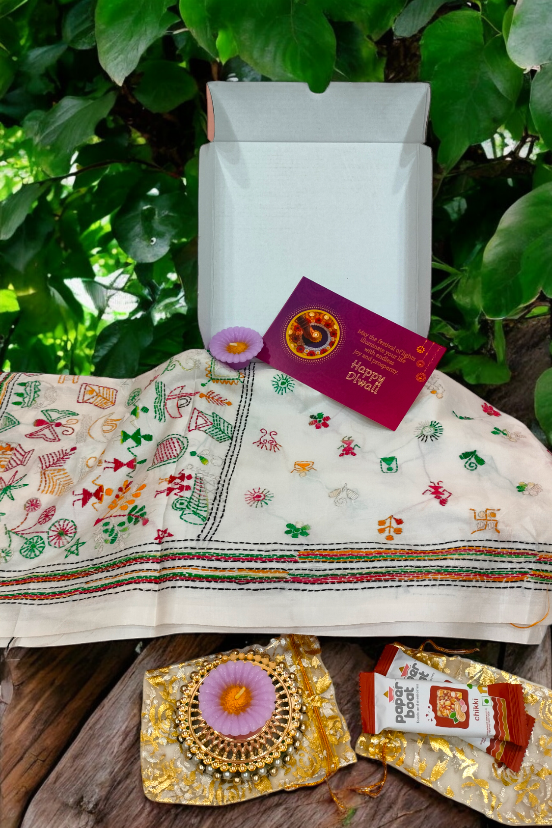 White Blended Silk Kantha embroidery stole Festive Gift Box