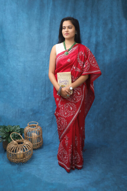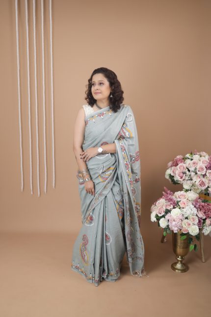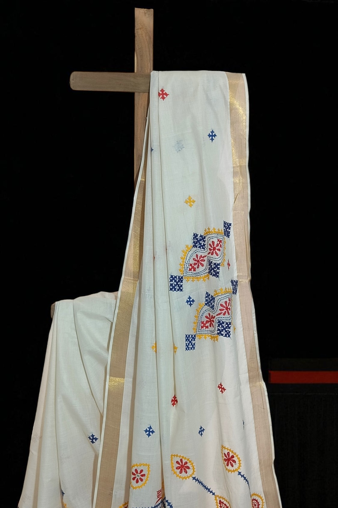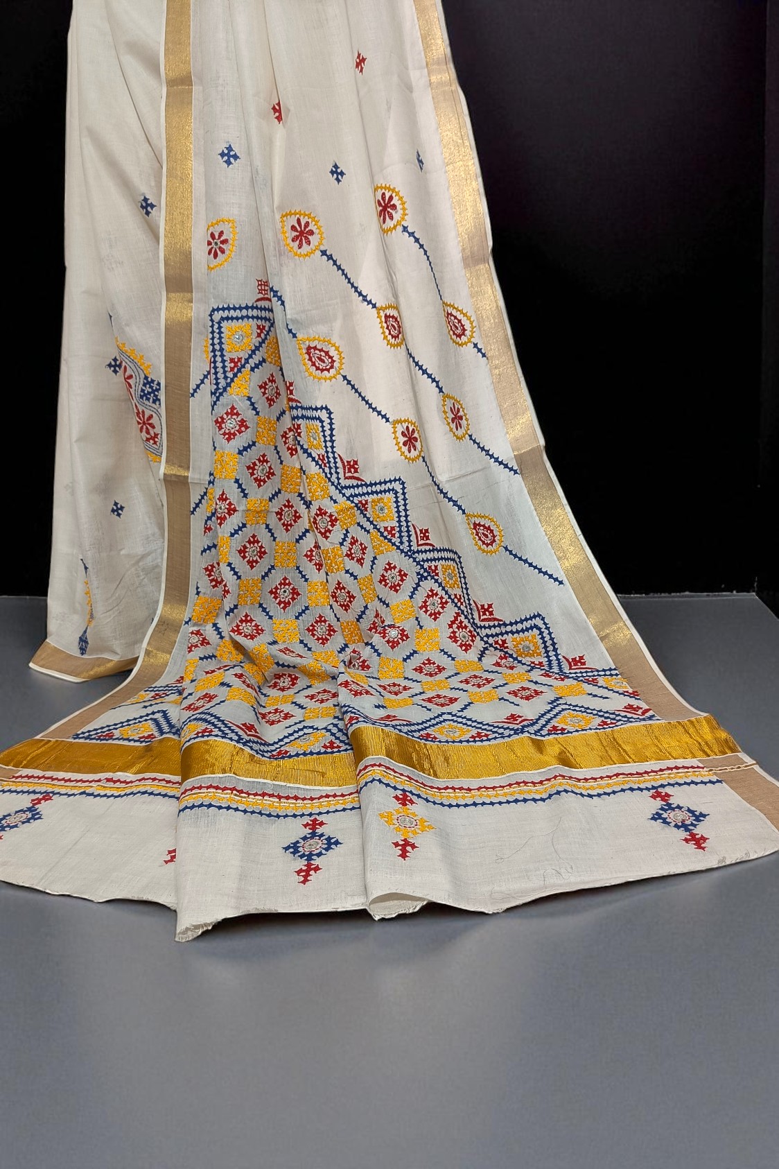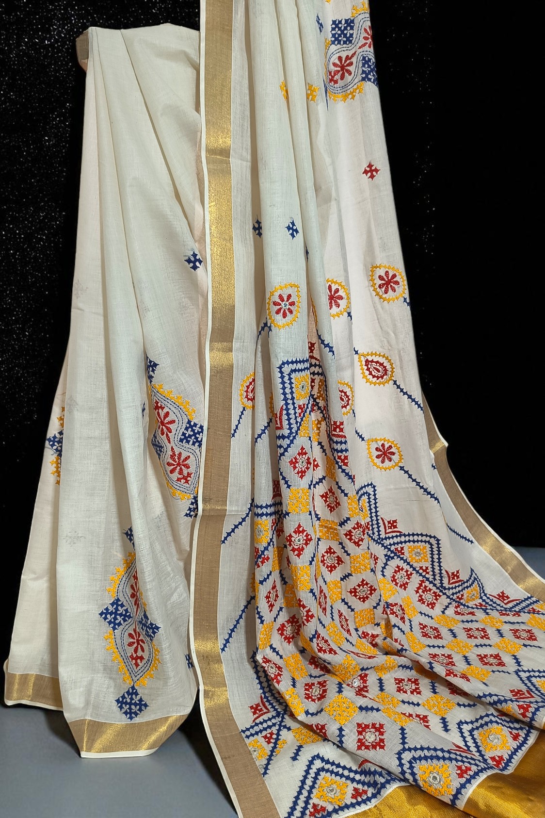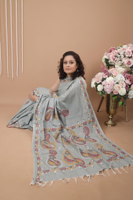White Kerela Cotton Kantha Embroidery Sari