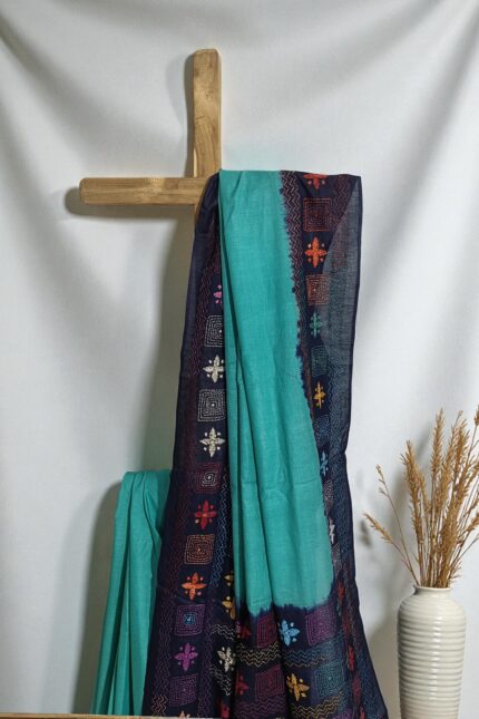 A beautiful White Kerela cotton sari with intricate kantha embroidery and golden border throughout the sari as well as in the pallu . The sari comes with a running blouse piece with kantha embroidery border.