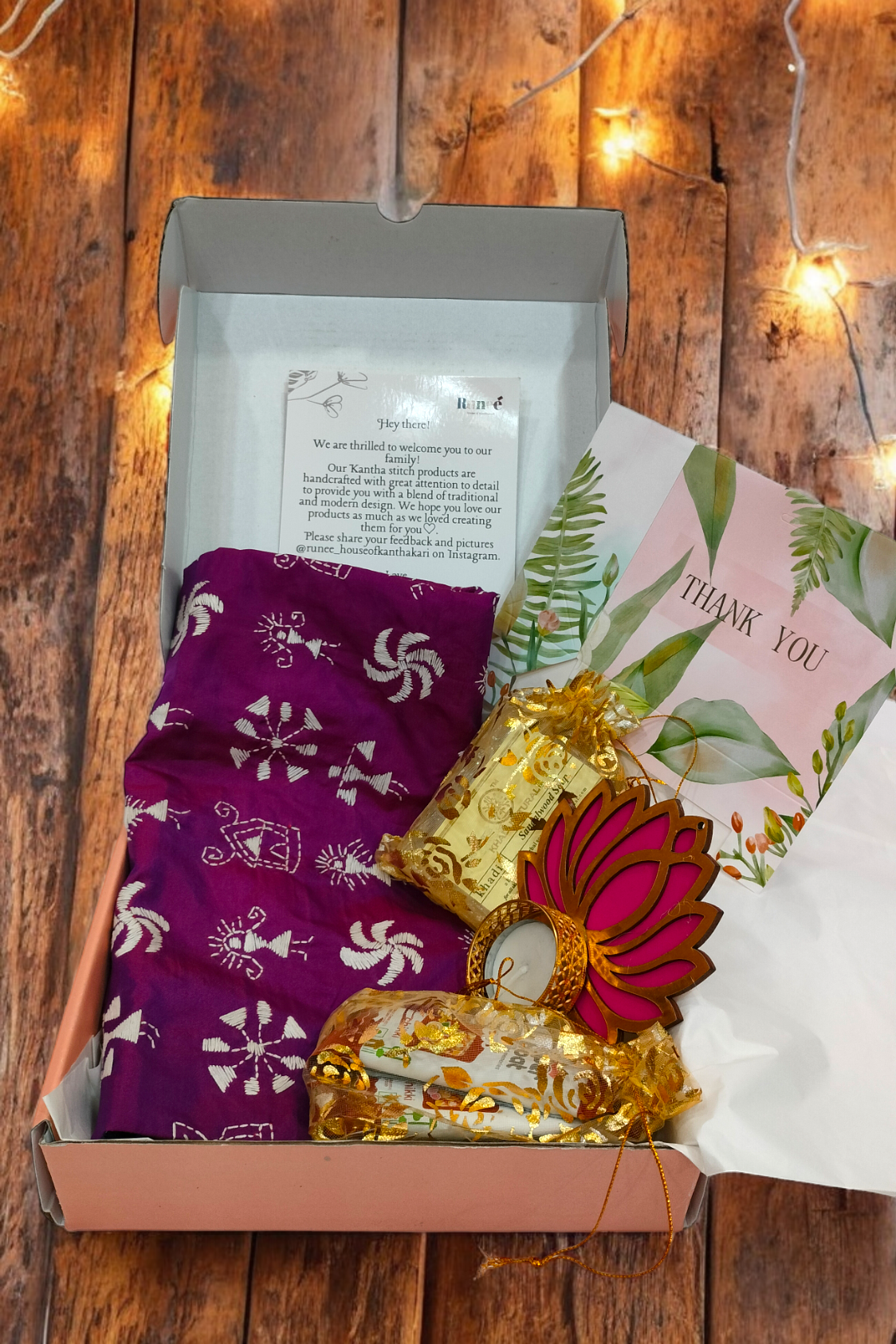 Introducing our exquisite handcrafted gift hamper, perfect for adding to your festive celebrations. Inside this Hamper you will find a beautifully crafted Wine Blended Kantha Embroidery Stole, a testament to artistry and elegance.
